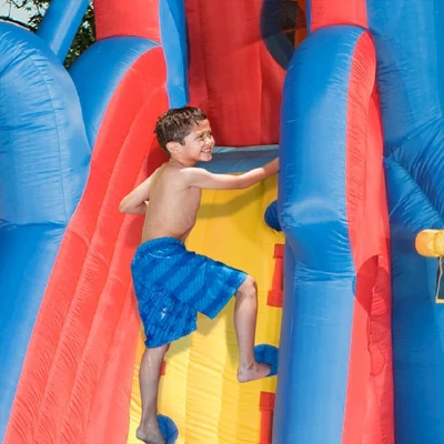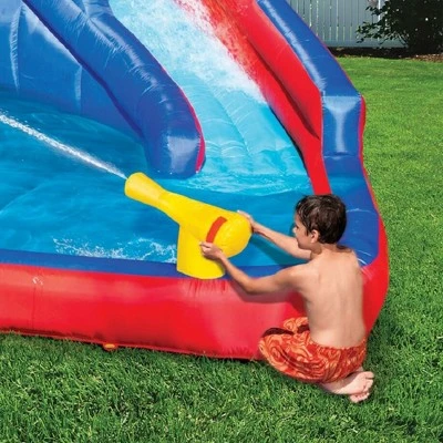 Take the fun of the water park and combine it with the convenience of fun in your backyard with the Banzai Hydro Blast Water Park.When using the included blow motor, this inflatable waterpark is ready for action in less than 3 minutes. Crafted from heavy-duty Dura-Tech material, this water slide activity set is large enough for a backyard kids’ party. Rocket down the double-lane racing slides or take the scenic route with the super-tall curved slide. You can also test your aim on the basketball hoop or 2 water cannons. Cool off under the sprinkles at the top of each slide for extra relief on hot summer days.For ages 5 and up, this backyard waterpark includes anchor stakes, weighted bags, storage bag, and repair kit for extra safety and peak functionality.You won’t be disappointed no matter what part of this activity center you use. Transform your backyard into the water park of your dreams with the Hydro Blast Inflatable Activity Park Play Center from Banzai.