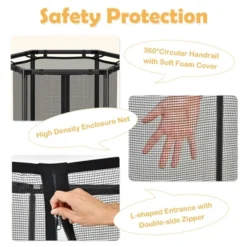 - 360° Enclosure Protection Net: The seamless design between the enclosure net and the jump mat can prevent kids from getting stuck in the gap and ensure their safety during playing. Besides, the soft foam-covered handrail provides 360° protection for children and allows them to grasp it easily to control the bounce.