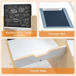 - Humanized Design: There are multi-layer open shelves to place various snacks, drinks, fruits, etc. And you can write daily specials on the blackboard to attract customers. This wooden grocery store is equipped with a small refrigerator with handle and door stopper to cold different treats.