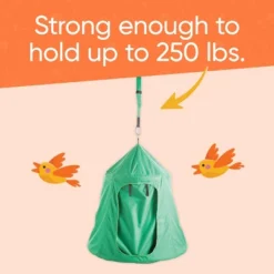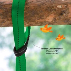 How can I swing on my favorite tree, you ask? The answer: Hearthsong Heavy-Duty Multi-Use Hanging Strap! The 50”L green hanging strap can hold up to 250 lbs. That’s the equivalent of one giant, cute panda. Aww! Hang your much-loved hammock, your HugglePod, or even your spacecraft by easily looping the hanging strap to a tree branch 10-12” in diam. and attaching your swing with the sturdy carabiner clip. Now you can swing into full gear! Swing for the fences, just not into the fences! Please note that the Hanging Strap is not intended for use as a spinner. Swivel Spinner Hardware sold separately (732960).