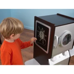The KidKraft Laundry Play Set lets kids clean and dry their clothes just like Mom and Dad. This kid-sized stacking washer and dryer set is sized for loads of fun and imagination. It includes a play iron, a laundry basket, shelving and a chalkboard on the side. With its realistic design and interactive pieces, this sturdy wooden set has plenty of playtime value. Teaches valuable social and interactive life skills and lets kids mimic and role play what they see at home. Great on its own but also pairs well with any KidKraft kitchen or role play item. Doing the laundry has never been this thrilling!