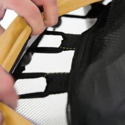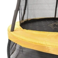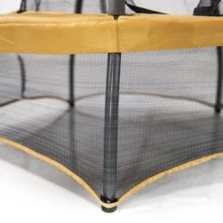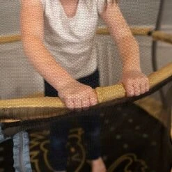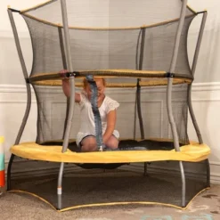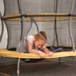 - DESIGN: Our mini indoor trampolines are designed with protection in mind. This mini trampoline features 36 stretch bands instead of steel springs, and a soft frame pad covers the stretch bands to prevent any pinch points. A 360-degree padded handlebar offers stability for your little jumper, and the enclosure net is sewn directly to the jump mat, eliminating gaps.