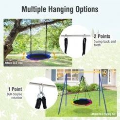 - Customized Design: The flying saucer swing has multiple ways to connect: 1-point hanging to swing back and forth, 2-point hanging to rotate 360 degrees. Furthermore, you can attach the swing to a swing frame set or a tree, and the height can be adjustable to meet different needs.