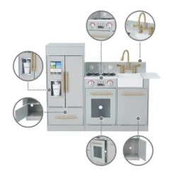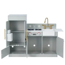 Our Little Chef Charlotte Modern Play Kitchen is extremely stylish and versatile – The contemporary design with timeless silver gray color complement a wide range of decors so is the perfect addition to any playroom. The fridge unit is separate from the sink and stove portion so you can arrange it as you wish. The fridge has three doors and an ice maker with cubes to mimic a real-life kitchen experience. The stove has two oven door, 2 hobs, one sink and two knobs which turn and click. It includes large storage space below the sink perfect for storing their toys and kitchen accessories, helping them learn the importance of maintaining a clean and tidy space. It has all the features needed for endless hours of fun! Our kitchen crafted from high-quality MDF to guarantees its stability and durability.
